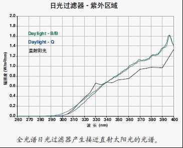 日光、延展紫外線、或窗玻璃過濾器用來降低不需要的輻射,獲得接近測試材料最終應用條件的光譜。氙燈模擬戶外曝曬條件時通常使用日光過濾器。氙燈試驗箱所有款式和型號的日光過濾器,都必須符合ISO 4892、ISO 11341 或 ASTM G155 中的光譜要求。它們產(chǎn)生的光譜非常接近直射太陽光。