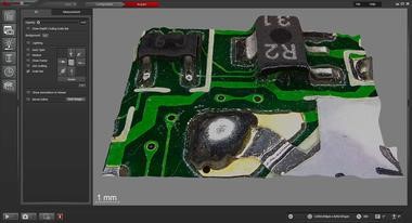 顯示集成電路芯片和焊點的局部 PCB 三維圖像;利用 Leica DVM6 通過 LAS X EDOF(擴展景深)功能捕捉。亦可參見右側(cè)帶彩色 Z 標尺的相同圖像。