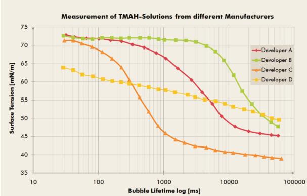 動(dòng)態(tài)表面張力(隨時(shí)間變化的潤(rùn)濕行為)對(duì)涂層的均勻性和一致性有著非常重要的影響,靜態(tài)測(cè)量法如吊片和拉環(huán)的方法并不適用于這類問題的分析,因?yàn)樗麄儨y(cè)量的是靜態(tài)表面張力而非動(dòng)態(tài)表面張力。此外,使用靜態(tài)法測(cè)量后,必須對(duì)測(cè)試設(shè)備進(jìn)行非常復(fù)雜的清洗,這會(huì)耗費(fèi)大量的時(shí)間。德國(guó)SITA公司根據(jù)不同的應(yīng)用領(lǐng)域,提供不同的解決方案以檢測(cè)槽液配方的表面張力?;趧?chuàng)新的氣泡壓力法,析塔SITA表面張力儀可以精確、快速的測(cè)量動(dòng)態(tài)表面張力,從動(dòng)態(tài)到準(zhǔn)靜態(tài)的表面張力 。