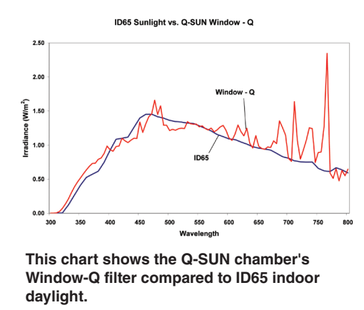 ICH指南沒有規(guī)定光譜是否應(yīng)與D65或ID65匹配。通常,ID65光譜是用Q-SUN中的WINDOUS-Q 濾光片模擬的,因為它模擬了進(jìn)入建筑物內(nèi)部的陽光。然而,日光濾光片適用于室外應(yīng)用,如染發(fā)劑和防曬霜。