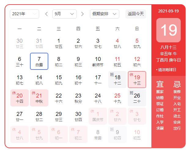 中秋節(jié)9月19日(星期日)至9月21日(星期二)放假調休3天,9月18日(星期六)正常上班。