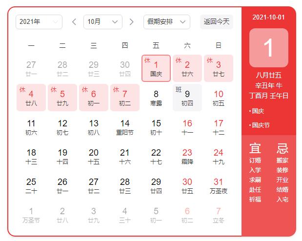 國慶節(jié)10月1日(星期五)至10月7日(星期四)放假調休7天,9月26日(星期日)、10月9日(星期六)正常上班。
