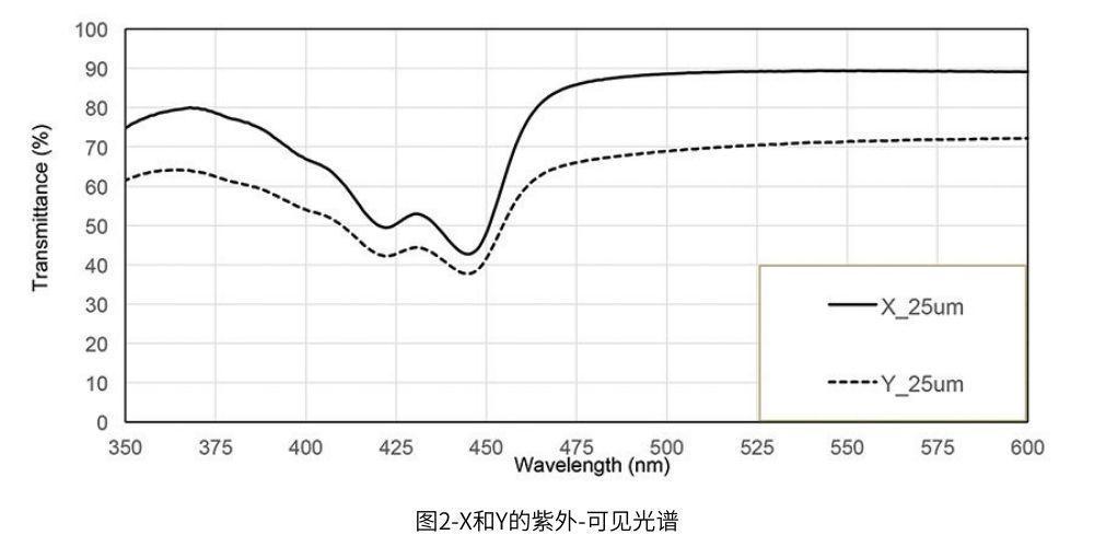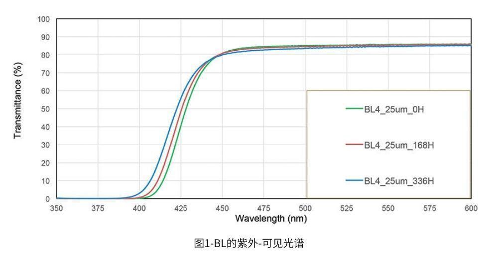 BL的透射率如圖1和表2所示。BL是一種25微米的光學透明粘合劑,能夠阻擋410納米的光透射,允許不到5%的光透過。樣品在500納米處的透射率保持相當高。