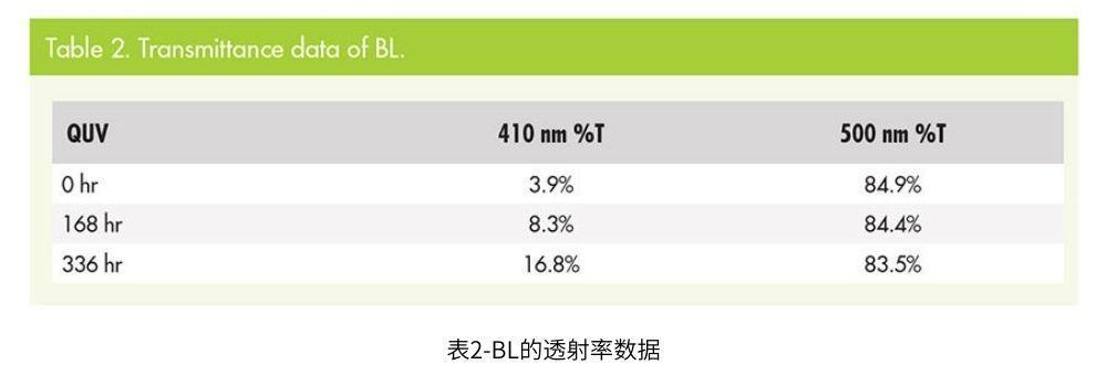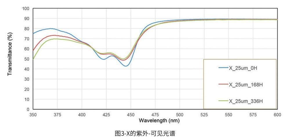 在QUV紫外老化箱進行加速老化試驗后,觀察紫外-可見光譜的變化。隨著紫外加速時間的推移,410-460 nm處的x透射率越來越高,如圖3所示(第14頁)。這是輻射導致染料降解的結果。如果聚合物含有吸收光線的雜質,它就會對紫外線敏感。因此,透射率在紫外區(qū)下降。相比之下,通過照射,BL在380-440 nm區(qū)域輕微退化,并且在500 nm的透射率結果保持相當高。