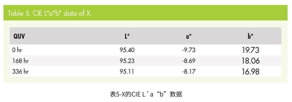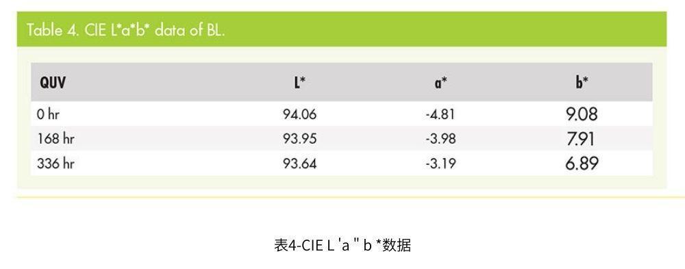如果b*色是深黃色,會影響人的視線。BL是一種25 m的光學透明粘合劑,其b*值為9.08(見表4)。相對而言,X顯示b*為19.73,隨著QUV加速老化測試時間的推移,越來越低(見第16頁表5)。所以BL耐候性比黃色溶劑染料好,不影響視覺變化。
