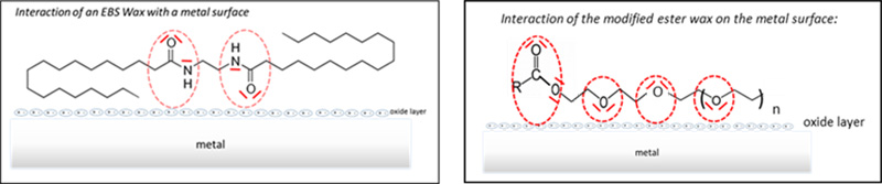 化學結(jié)構產(chǎn)生的脫模/潤滑作用:改性聚酯蠟的極性酯基團和線性分子,使得它與金屬表面有很好的附著力和親和力。這種附著力在金屬加工時提供了離型/潤滑效果。