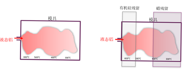 在壓鑄過程中我們發(fā)現(xiàn)模具中不同空間位置的溫度不同。熱的鋁被壓進模具并且在里面冷卻,導致模具不均勻的溫度分布。在模具中溫度低的部分會時常出現(xiàn)蠟堆積后產(chǎn)生的殘渣。這些殘渣會帶來鑄造過程中模具最大壓力的降低和尺寸偏差。 冷區(qū)域里溫度不足以燃燒掉所有的蠟,導致蠟容易堆積需要用機械外力清除。