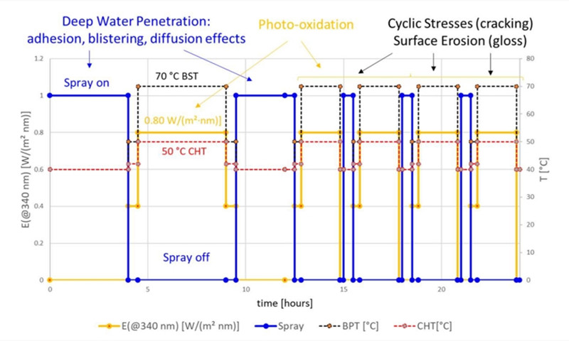 SAE J2527 每天有 16 個濕干循環(huán),ASTM D7869 每天有5個濕干循環(huán)(下圖)。如果一種材料對這種機械應力敏感,那么 SAE J2527 可能是更好的選擇。