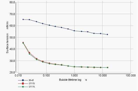 2)需要在某氣泡壽命段,調(diào)低體系表面張力時,需要更低表面張力的助劑,反之變?nèi)?。使用動態(tài)表面張力儀先測出各助劑的曲線,根據(jù)曲線選擇比原來體系表面張力更低的助劑,使配方研發(fā)更快速準確。
