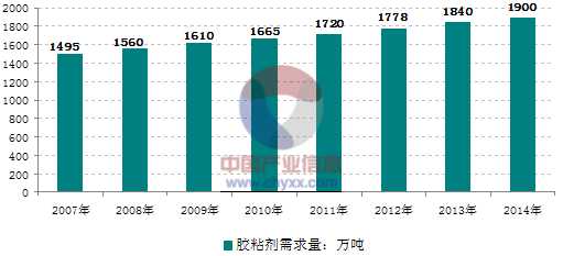 2007年全球膠粘劑需求總量為接近330億磅(約合1495萬(wàn)噸),到2014年全球膠粘劑需求增長(zhǎng)至1900萬(wàn)噸。