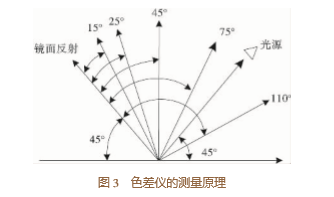 其原理是將色差儀的測量孔嚴(yán)密貼合在被測物的表面上, 色差儀光源由 45°照射被測物表面,各方向的感應(yīng)器接收反射光并將接收到的反射光數(shù)據(jù)化。這里定義被接收到的反射光與鏡面反射光之間的夾角為測量角度,如圖 3 所示,某型號色差儀可獲得 15°、 25°、 45°、 75°、110° 5 角度的 L 、 a 、 b 或 L 、 c 、 h 等數(shù)據(jù),其中最常 用的是 25°、 45°、 75° 3 角度的 L 、 a 、 b 數(shù)據(jù)。