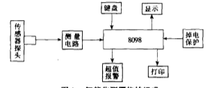 是由高頻渦流發(fā)射式傳感器探頭,測量電路,8098單片機(jī)控制系統(tǒng)組成。如圖所示:
