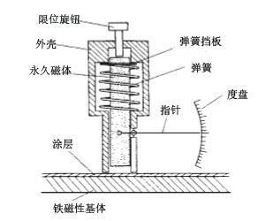 圖解:圖中下部鐵磁性基體是被測物體,由鐵磁性基體和涂層構(gòu)成,其余部分是機械式磁法測厚裝置,或稱作探頭。