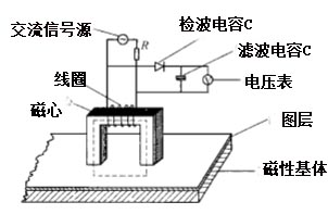 當涂層厚度不同時 ,磁回路的磁阻將不同 ,即涂層厚度較薄時 ,回路的磁阻小;涂層厚度較厚時,回路的磁阻大。磁阻的變化導致了電感線圈的電感量和阻抗的變化。在信號源和內(nèi)阻R參數(shù)不變的情況下,電感兩端的電壓將隨涂層厚度的變化而變化,即利用此電壓可表征涂層厚度。這時將此電壓送至二極管D檢波和電容器C濾波后 ,經(jīng)標度變換,送至電壓表或數(shù)碼顯示電路,顯示出涂層厚度值。