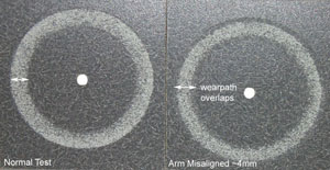 Taber試驗臂的對準(zhǔn)是影響磨料的手臂的對齊,這就是上所述的車輪定位問題。一個4mm的錯位的影響包括約1000平方毫米的磨損區(qū)域的變化,和一個不太積極的測試。車輪重疊將從100%減少到約65%。圖片右側(cè)顯示層壓板臺面材料與儀器具有這個條件測試。