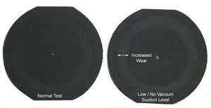 一個正常的泰伯真空系統(tǒng)從試樣表面的磨損試驗過程中產(chǎn)生的清除雜物是必要的(包括適當(dāng)?shù)恼婵諊娮旄叨群驼婵瘴λ?。沒有真空,碎片可以建立在試樣有可能改變磨損類型從體3體。對于一些材料,如皮革,這種碎片可能會形成一個保護性的屏障,減少了車輪所造成的磨損量。對于其他樣品,如 涂層塑料,碎片積累的結(jié)果在一個更積極的測試,導(dǎo)致高于正常的霧度值。右邊的圖像顯示這種現(xiàn)象在一個皮革標(biāo)本。