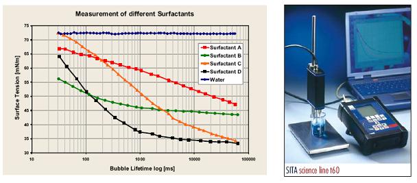 表面活性劑被廣泛應(yīng)用于許多工業(yè)中,用于改善產(chǎn)品性能。因此就需要檢驗(yàn)和分析表面活性劑的行為。表面活性劑主要的特點(diǎn)是它們的表面活性,即它們擴(kuò)散和吸附到新形成界面并影響其表面張力。因此,對于許多用途而言必須要知道表面活性劑的吸附過程快慢,以及在短時間內(nèi)表面張力的下降速度。由于表面張力依賴于表面活性劑的含量,所以我們可以通過測定表面張力的含量來分析表面張力。此外,溫度同樣會影響表面張力;測量表面張力也可以用于分析一種或多種表面活性劑混合的臨界膠束濃度。