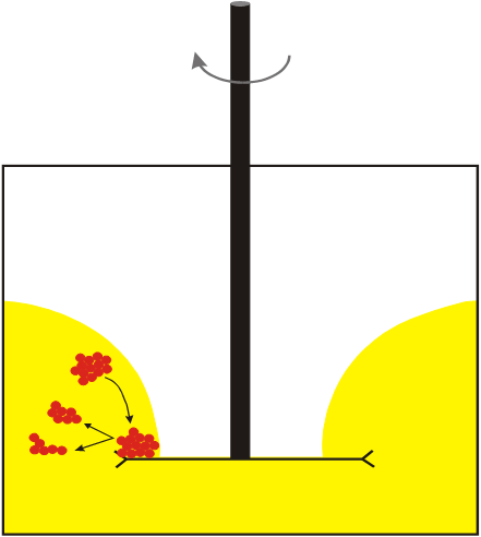 樹脂溶液中加入顏料和填料后,通過增加軸的轉(zhuǎn)速,物料進入層流模式,直到容器壁上見不到粘附的材料。在合適的轉(zhuǎn)速下,軸的周圍會形成一個通道并逐漸能看見分散盤,這時物料就形成了甜甜圈形狀的流型。甜甜圈流型的形成是表示輸入到物料中的機械功率已達最大,此外,由于物料被攪動,故所有的團聚體都能抵達分散盤外沿。