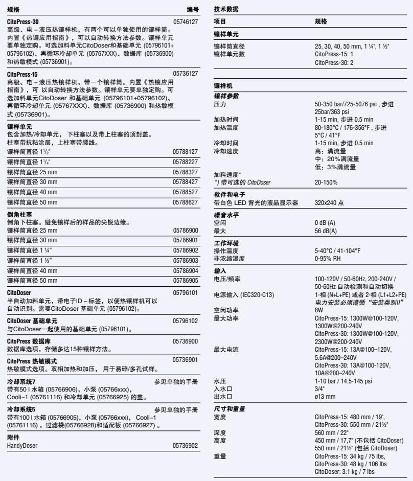 CitoPress-30 是一款先進(jìn)的電動(dòng)液壓可編程雙筒鑲樣機(jī)。CitoPress-30 提供全過程控制、數(shù)據(jù)庫(kù)設(shè)施,使兩個(gè)鑲樣筒能夠同步或獨(dú)立運(yùn)行。內(nèi)置含自動(dòng)轉(zhuǎn)換的方法參數(shù)的熱鑲嵌應(yīng)用指南。鑲嵌單元需單獨(dú)訂購(gòu)??蛇x擇訂購(gòu)的加液?jiǎn)卧?CitoDoser 和基本單元、循環(huán)冷卻系統(tǒng)、數(shù)據(jù)庫(kù)和靈敏模式。