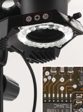 內(nèi)置的4點(diǎn)環(huán)形光源是用于入射光的應(yīng)用,它提供了均勻的,明亮的照明區(qū)域,而在需要時(shí)可調(diào)整的3點(diǎn)斜光可以提供更高的對(duì)比度。