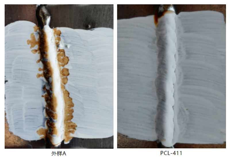 PCL-411與市面某主流產(chǎn)品“外樣A”進(jìn)行對(duì)比,在0.5%防閃銹添加量情況下,觀察鋼板與焊縫中表面不同效果。