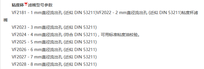 荷蘭 TQC VF2181 濾嘴是荷蘭進口的,型號是VF2181,符合DIN53211,直徑是1mm。那么,粘度杯濾嘴不同型號參數(shù)如下: